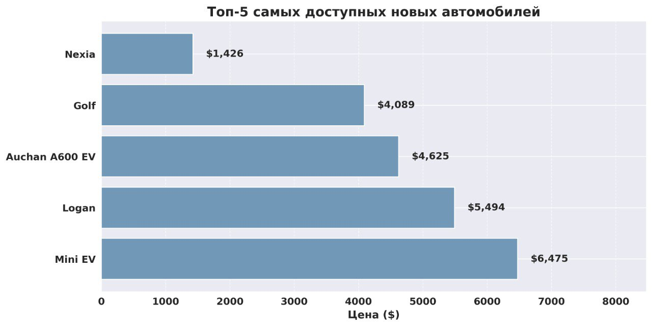 Абсолютным лидером по доступности стала Nexia, которую можно приобрести за $1 тысячу 426. На втором месте — Golf ($4 тысячи 89). Далее идут электромобиль Auchan A600 EV ($4 тысячи 625), Logan ($5 тысяч 494) и еще один электрокар — Mini EV ($6 тысяч 475).Разница между самой дешевой и самой дорогой машиной в списке — 4,5 раза, что, по мнению аналитиков, отражает широкую сегментацию даже в бюджетной категории.