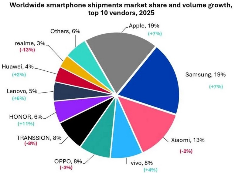 Apple третий год подряд возглавила рейтинг крупнейших производителей. Компания продемонстрировала рекордный объем продаж iPhone — 240,6 миллиона штук, что на 7 процентов больше показателей предыдущего периода. Успеху способствовал выход линейки iPhone 17, благодаря которой продажи марки в КНР взлетели на 26 процентов.
