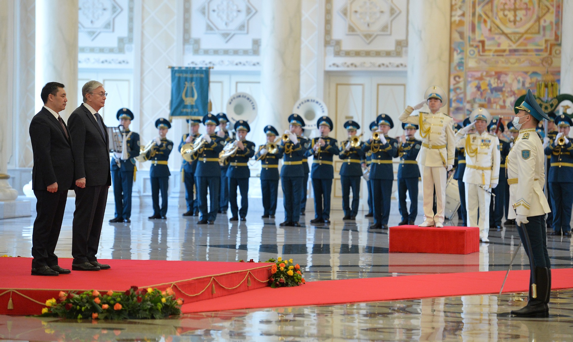Отмечается, что церемония прошла во дворце президента «Акорда» в городе Нур-Султане. После взаимных приветствий глав государств оркестр Республиканской гвардии исполнил государственные гимны Кыргызстана и Казахстана. Далее начальник почетного караула отдал приветственный рапорт главам государств, после чего они по ковровой дорожке направились к государственному флагу Республики Казахстан и легким поклоном головы поприветствовали государственный символ.