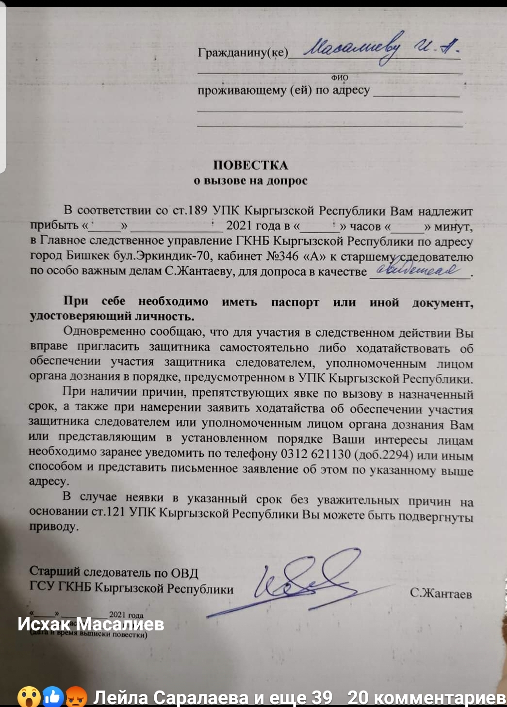Экс-депутата парламента Исхака Масалиева вызвали на допрос в ГКНБ. Об этом он сообщил на своей странице в Facebook.