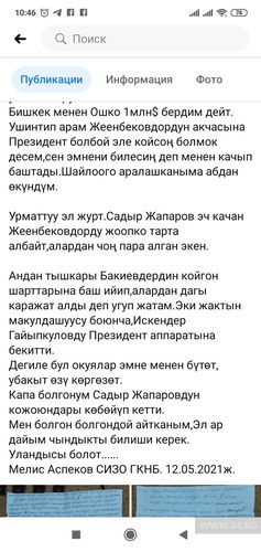 «Жапаров сказал, что ему нужен доверенный человек, чтобы проконтролировал расходы штаба. Он отметил, что, если не выиграет гонку, его посадят, поэтому надо выиграть в первом туре. Во время агитации Садыр Жапаров лично мне в руки, поделив на три части, передал $1 миллион. В доказательство своих слов я публикую копии паспортов и расписки о получении денег координаторами районов», — пишет Мелис Аспеков.