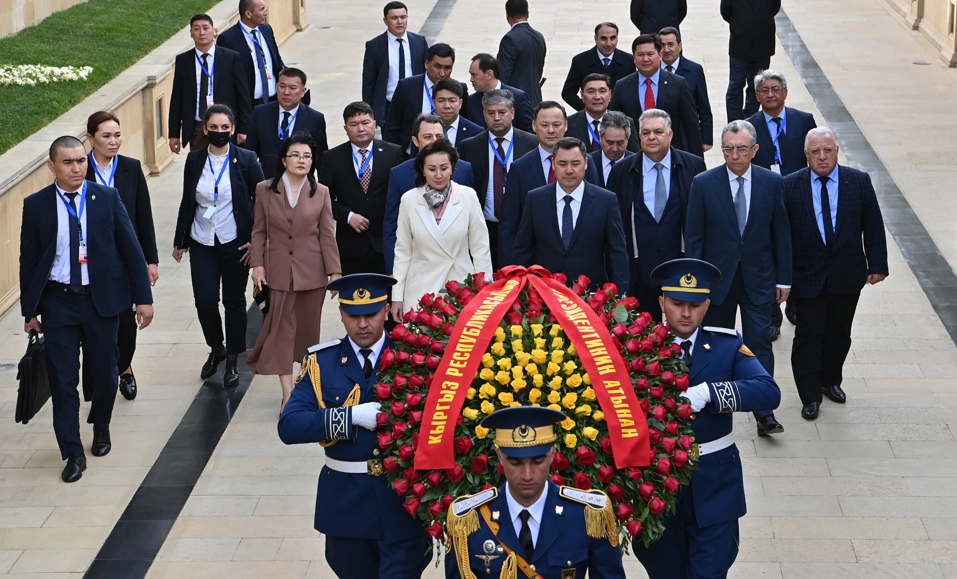Далее делегация Кыргызстана посетила «Аллею шехидов», где был выстроен почетный караул. После того как Садыр Жапаров почтил память павших героев Азербайджана, прозвучали государственные гимны двух стран.