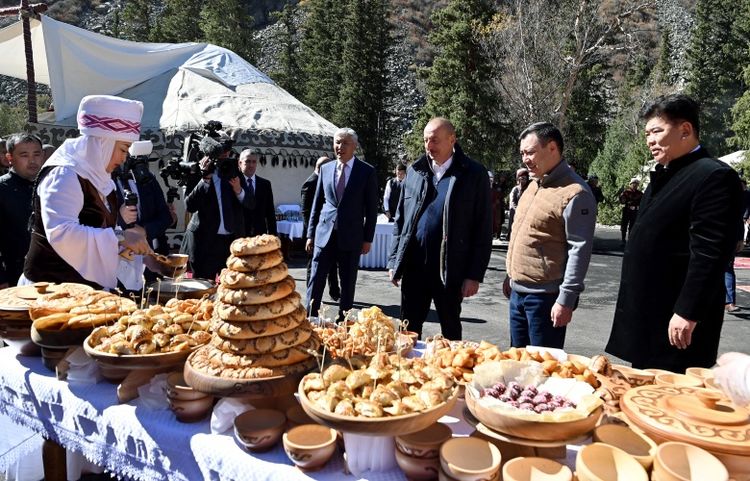 Лидеров стран встретили 12 богатырей и акыны. На аллее ремесленников президенты ознакомились с национальными обычаями и традициями кыргызского народа, мастерскими ремесленников по изготовлению изделий ручной работы, национальных ковров-ширдаков.