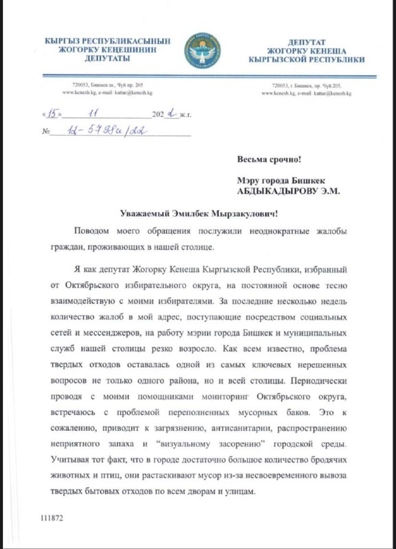 Депутат Жогорку Кенеша Дастан Бекешев обратился к мэру Бишкека Эмилбеку Абдыкадырову по вопросу несвоевременного вывоза бытовых отходов. Об этом он сообщил в своем Telegram-канале.