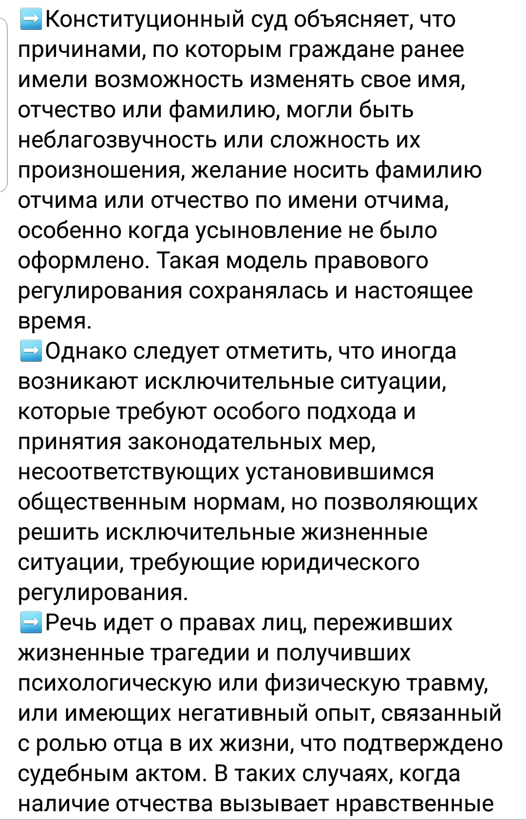 И добавила: Конституционный суд объясняет, что причинами, по которым граждане ранее имели возможность изменять свое имя, отчество или фамилию, могли быть неблагозвучность или сложность их произношения, желание носить фамилию отчима или отчество по имени отчима, особенно когда усыновление не было оформлено. Такая модель правового регулирования сохранялась и сейчас.