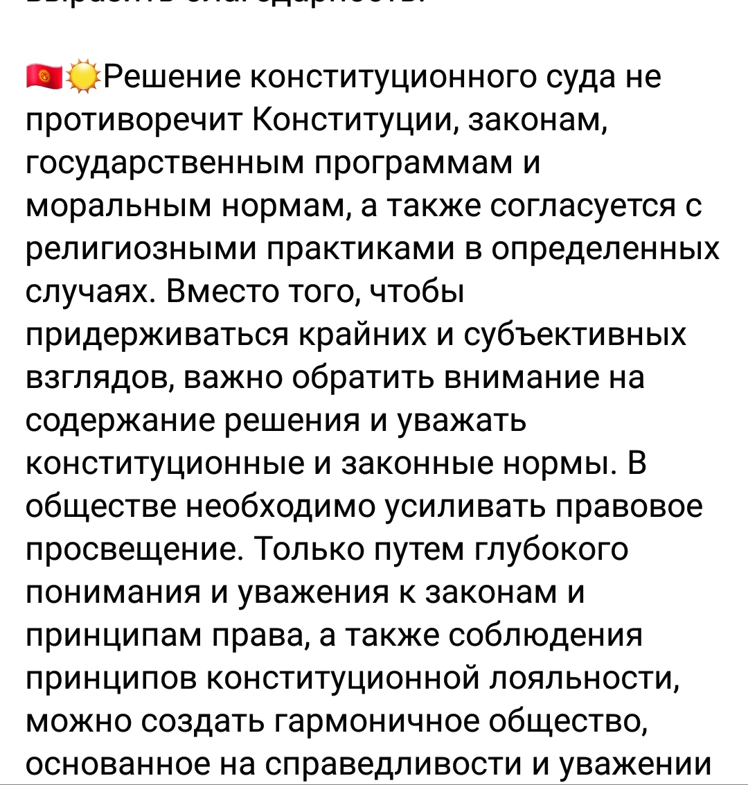 По мнению юриста, решение КС КР не противоречит Конституции, законам, государственным программам и моральным нормам, а также согласуется с религиозными практиками в определенных случаях.