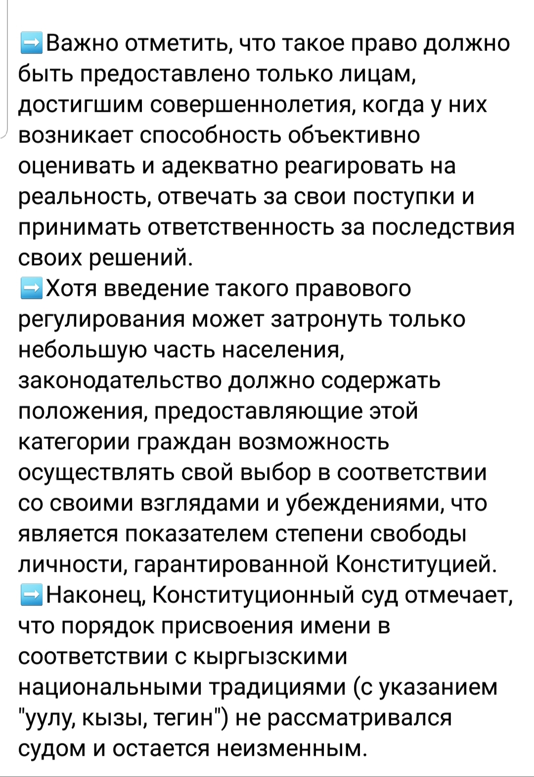«Наконец, Конституционный суд отмечает, что порядок присвоения имени в соответствии с кыргызскими национальными традициями (с указанием «уулу, кызы, тегин») не рассматривался судом и остается неизменным», — подчеркнула она.