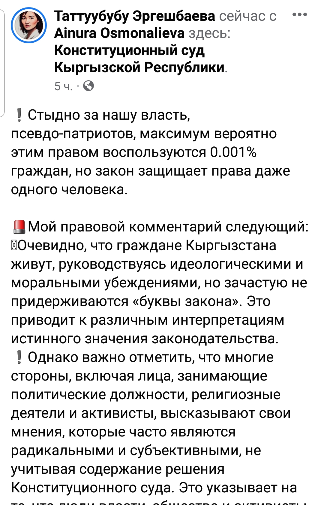 Татту Эргешбаева добавила, что желание отстоять личные убеждения не должно стоять выше основ конституционного строя и национальной безопасности КР. «Вместо того чтобы критиковать решение, если бы все стороны приступили к внимательному изучению содержания решения Конституционного суда, они могли бы оценить его значимость и даже выразить благодарность», — считает она.