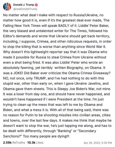 Он опубликовал пост и в очередной раз заявил, что конфликт между Россией и Украиной не произошел бы, если бы он был президентом, а также обвинил газету The New York Times в том, что какой бы хорошей ни была сделка, NYT будет говорить о ней плохо.