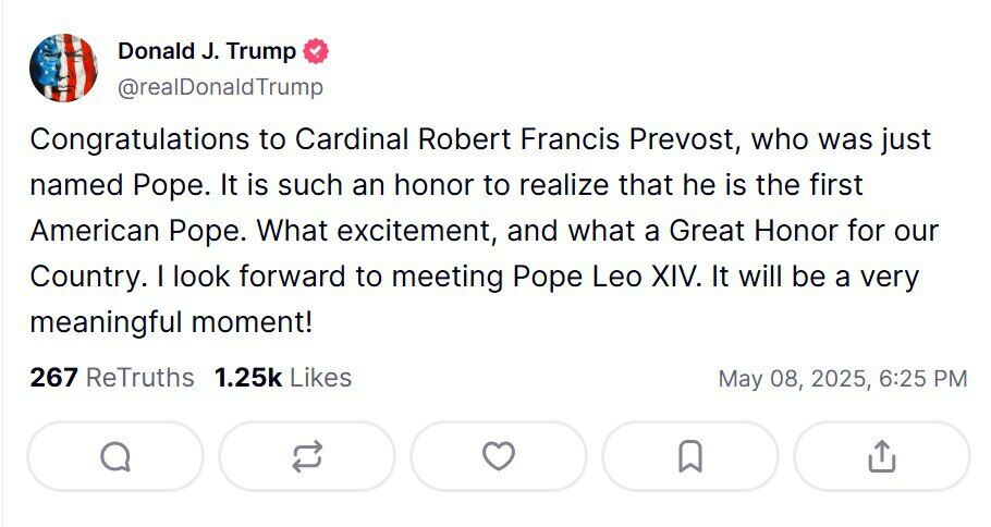 Президент США поздравил с избранием папу Льва XIV на своей платформе Truth Social.