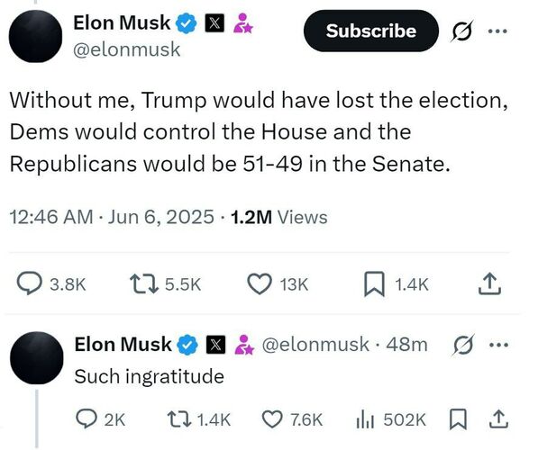 «Без меня Трамп проиграл бы выборы, демократы контролировали бы Палату представителей, а республиканцы имели бы 51-49 в Сенате. Какая неблагодарность», — написал он в соцсети X в ответ на заявление Дональда Трампа, сказавшего, что «очень разочарован» им.
