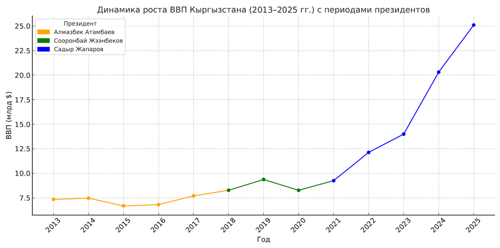 При Садыре Жапарове Кыргызстан демонстрирует устойчивый рост — выше 7 процентов ежегодно. В 2024-м — рекордные 9,6 процента.