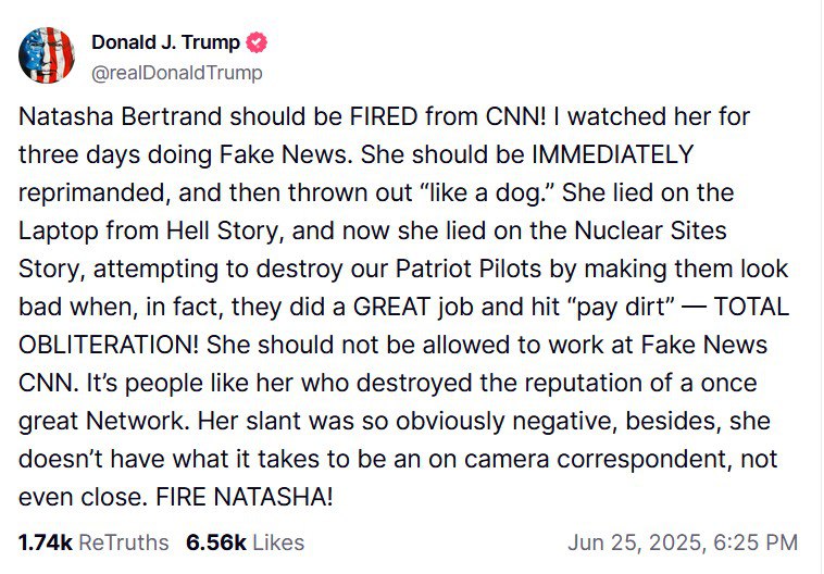Ранее глава Белого дома также призвал CNN «выгнать как собаку» журналистку Наташу Бертран за «фейковые новости» о разрушениях на ядерных объектах Ирана после ударов США.