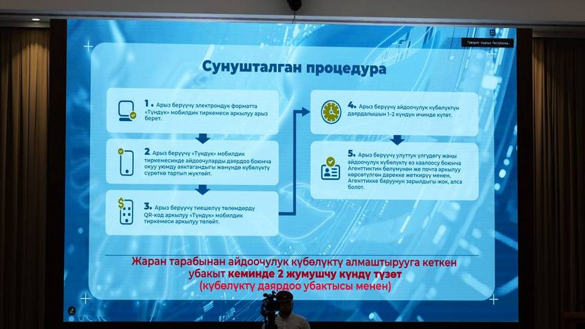 «Мы должны полностью сделать процесс онлайн. Подача заявления, загрузка необходимых документов, оплата и получение готового удостоверения должны осуществляться через мобильное приложение «Түндүк», — отметил Адылбек Касымалиев.