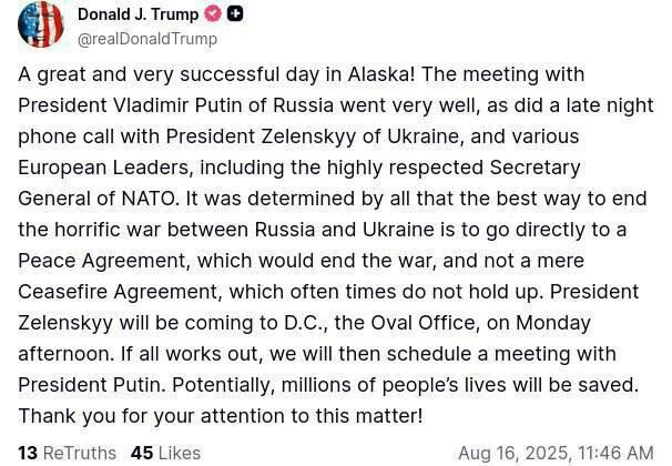 «Прекрасный и очень успешный день на Аляске! Встреча с президентом России Владимиром Путиным прошла очень хорошо, как и ночной телефонный разговор с президентом Украины Владимиром Зеленским и различными европейскими лидерами, включая высокоуважаемого генерального секретаря НАТО», — написал в своей соцсети Truth Social президент США.