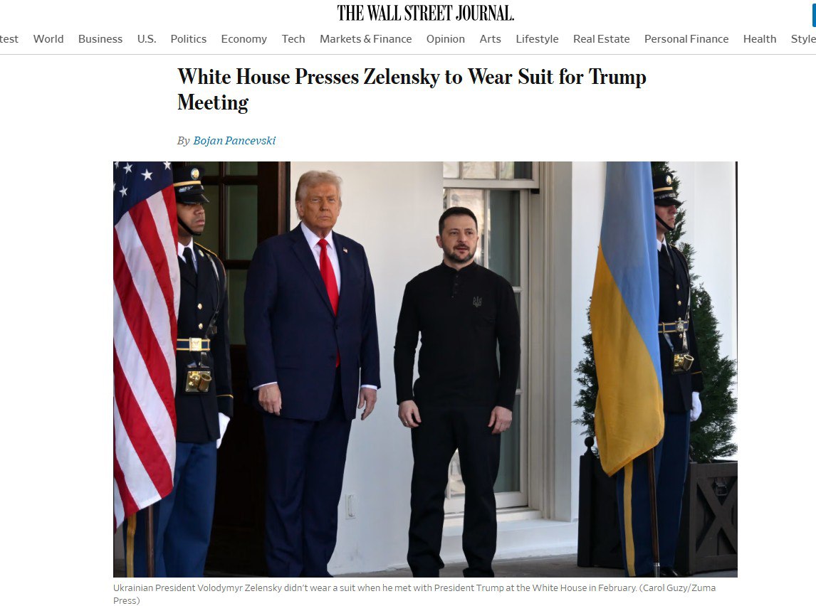 «По словам европейского чиновника и другого лица, также принимавшего участие в планировании этого саммита, Белый дом попросил Зеленского надеть костюм и галстук для встречи с президентом», — говорится в материале The Wall Street Journal.