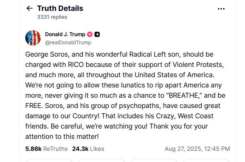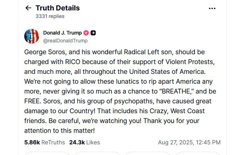 «Джордж Сорос и его замечательный сын, радикальный левак, должны быть обвинены по закону RICO за поддержку насильственных протестов и многого другого по всей территории Соединенных Штатов Америки. Мы больше не позволим этим безумцам разрывать Америку на части, не давая ей даже шанса «дышать» и быть свободной. Сорос и его группа психопатов причинили огромный вред нашей стране! В том числе и его безумные друзья с Западного побережья. Будьте осторожны, мы следим за вами!» — написал президент США.
