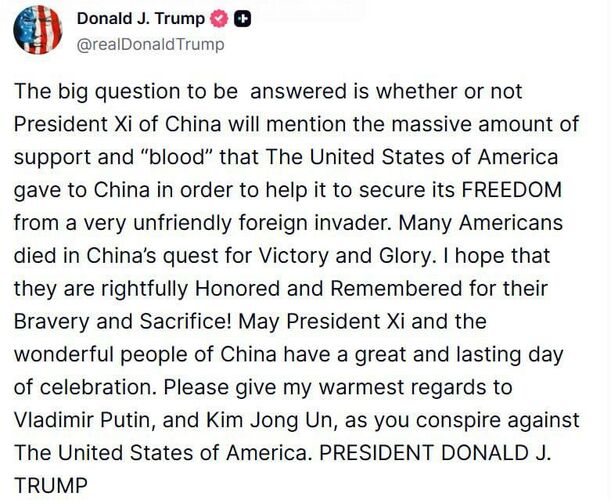 Американский президент, комментируя парад в Пекине, задался вопросом, упомянет ли председатель КНР в своей речи помощь Штатов во Второй мировой войне. По его словам, США помогли Китаю «обрести свободу от враждебного иностранного захватчика, многие американцы погибли, борясь за победу и славу КНР».