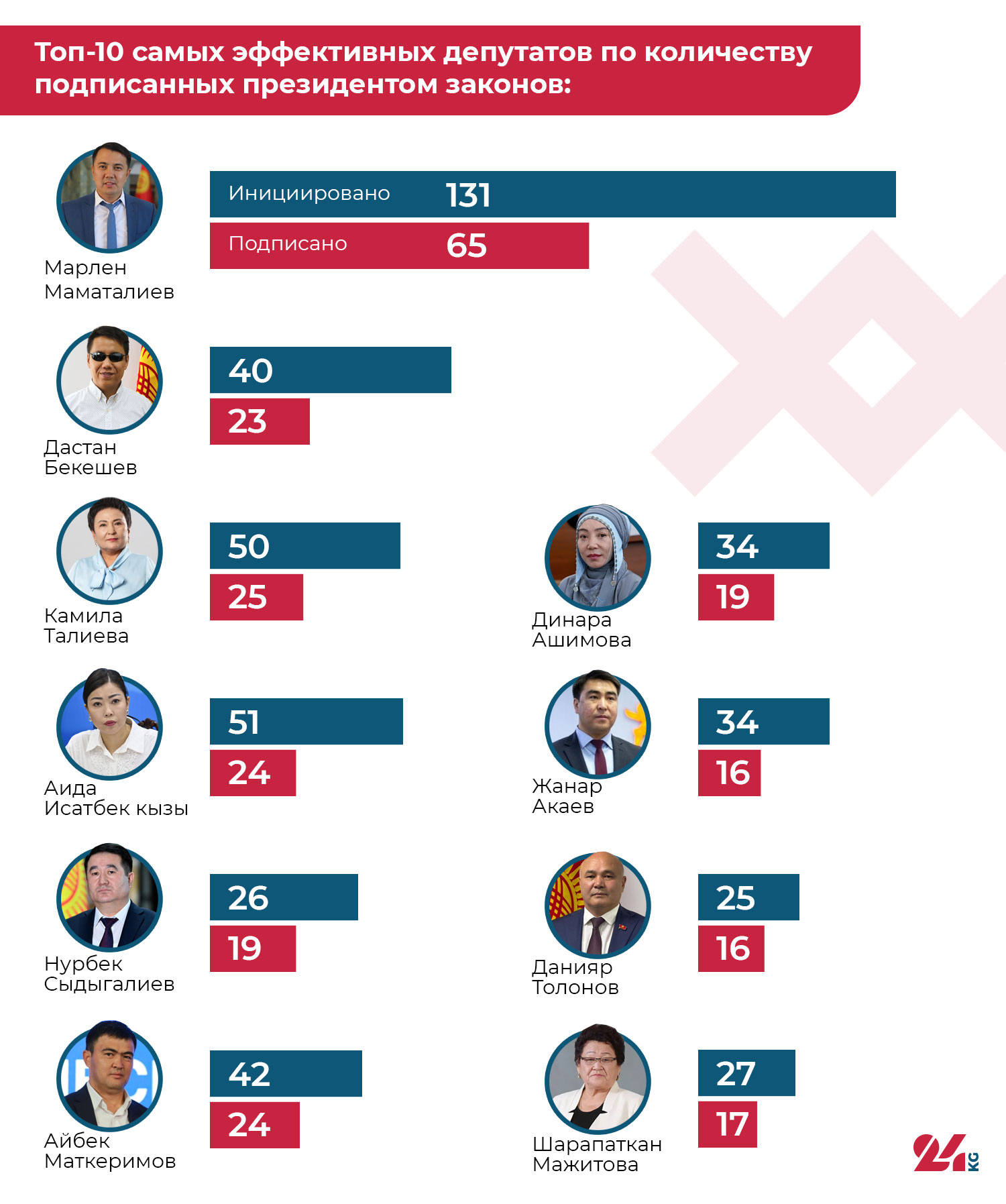 Абсолютным рекордсменом стал Марлен Маматалиев — 65 законов, подписанных президентом, при 131 инициативе и соавторстве. Это намного превышает показатели ближайших коллег.