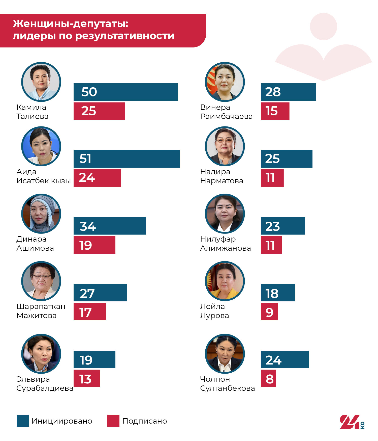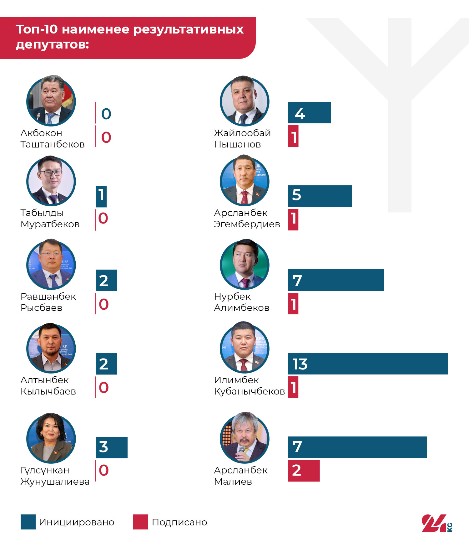 24.kg проанализировало данные об инициированных и соавторских законопроектах депутатов. Для объективности мы сложили оба показателя: сколько инициатив нардеп внес лично и сколько поддержал как соавтор. Итоговый критерий — общее количество законов, подписанных президентом. Данные предоставлены Жогорку Кенешем.