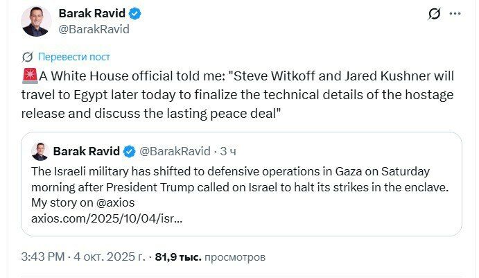 Журналист Axios Барак Равид со ссылкой на источник в Белом доме сообщил, что спецпосланник президента США Стив Уиткофф отправится в Египет. Ожидается, что он примет участие в переговорах по уточнению деталей освобождения заложников, обсудит пути прекращения войны и возможные шаги к установлению прочного мира.