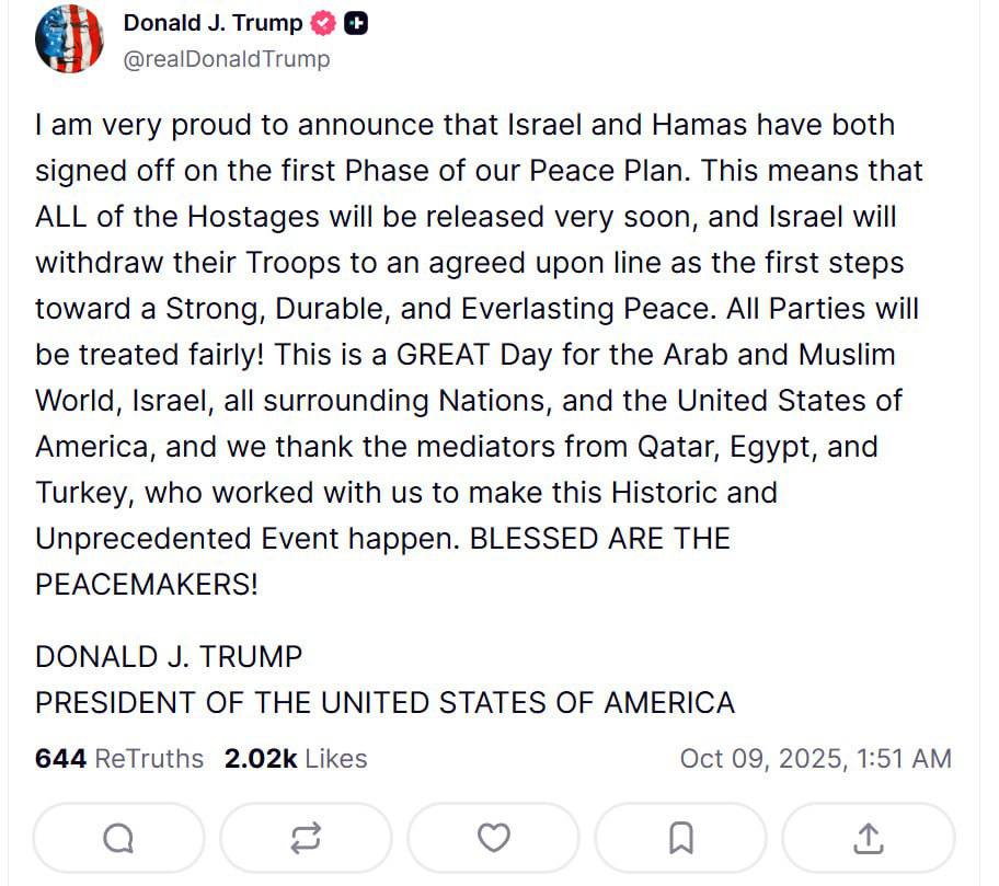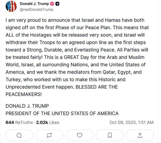 Израиль и ХАМАС подписали договоренности по первой фазе мирного плана. Это означает, что все заложники будут освобождены очень скоро, а Израиль отведет свои войска к согласованной линии. ХАМАС согласился на сделку. Израиль выведет войска, написал в своей соцсети Truth Social президент Соединенных Штатов.