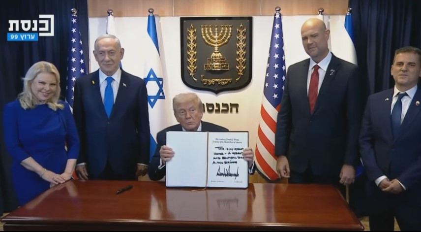 Глава Белого дома оставил запись в гостевой книге израильского парламента, назвав сегодняшний день «великим» и «новым началом». По его словам, движение ХАМАС согласилось выполнять предусмотренный мирным планом пункт о разоружении.