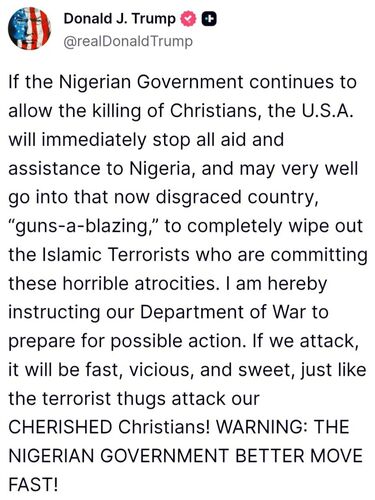 «Если правительство Нигерии продолжит позволять убивать христиан, США немедленно прекратят оказывать помощь и поддержку Нигерии и вполне могут войти в эту ныне опозоренную страну во всеоружии, чтобы полностью уничтожить исламских террористов, совершающих эти ужасные зверства», — написал он в Truth Social, добавив, что нигерийским властям стоит «действовать быстро».