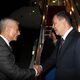 Выстроена рота почетного караула, солдаты которой держали флаги двух стран, расстелена ковровая дорожка.