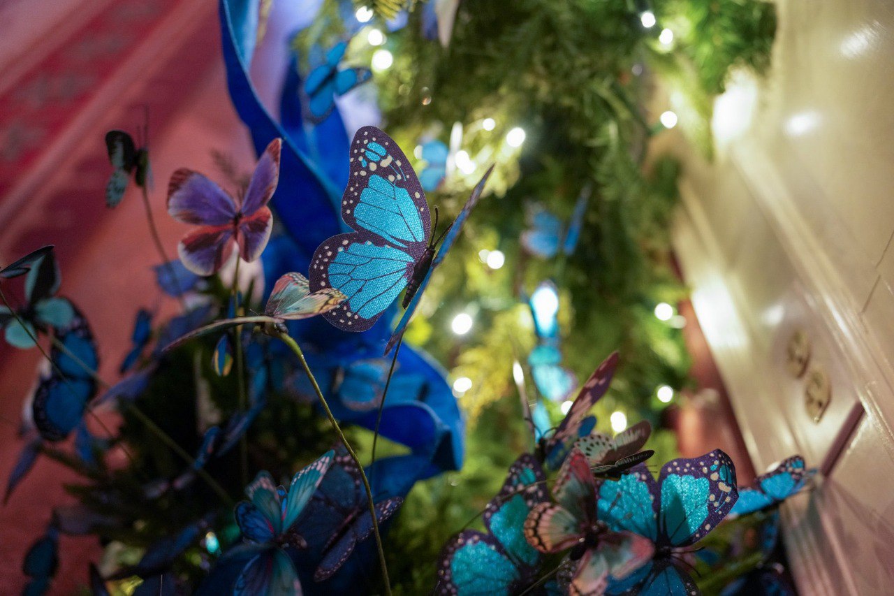 Красную комнату украшают тысячи синих бабочек, символизирующих инициативы первой леди Be Best в поддержку молодого поколения и Fostering the Future в поддержку детей, воспитывающихся в приемных семьях.