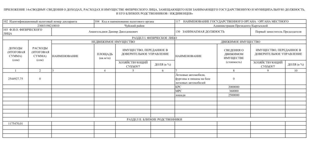 Доходы его близких родственников составили 1 миллион 175 тысяч 470 сомов.