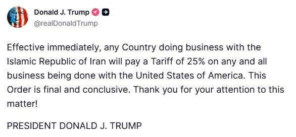 «Начиная с сегодняшнего дня любая страна, ведущая бизнес с Исламской Республикой Иран, будет платить тариф в размере 25 процентов на все операции, осуществляемые с Соединенными Штатами Америки. Этот указ является окончательным и безоговорочным», — говорится в сообщении.