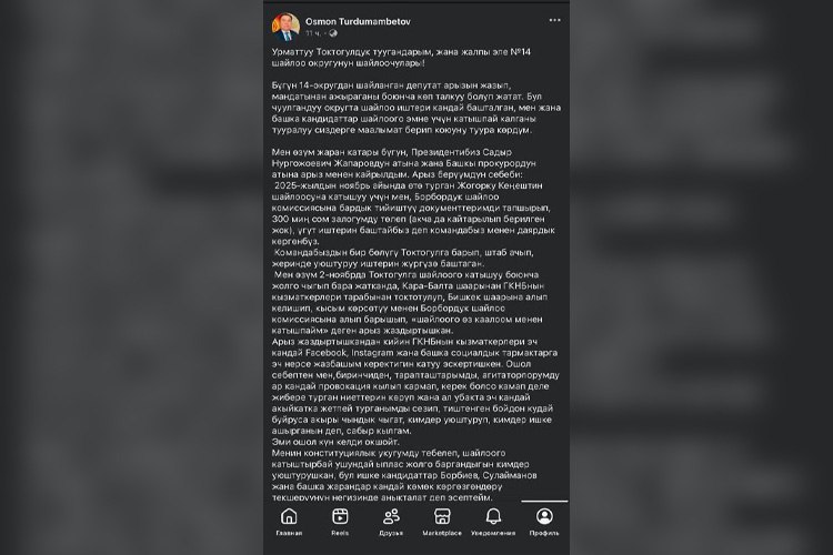 Бывший начальник налоговой инспекции и экс-депутат VI созыва Жогорку Кенеша от партии «Онугуу-Прогресс» Осмон Турдумамбетов заявил в своих социальных сетях о давлении со стороны правоохранительных органов в период избирательной кампании по округу № 14 в Токтогуле.
