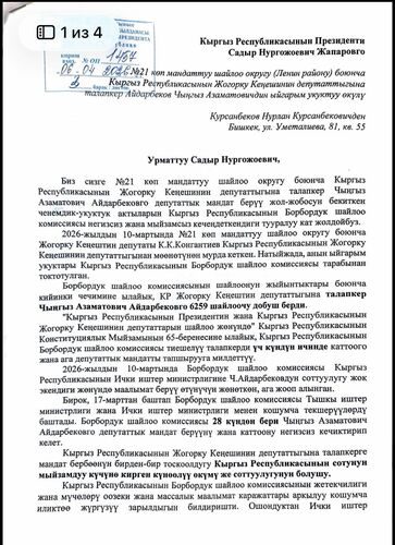 Как указано в обращении, после досрочного сложения мандата депутатом Куванычбеком Конгантиевым именно Чингиз Айдарбеков, набравший 6 тысяч 259 голосов, должен был получить депутатский мандат.