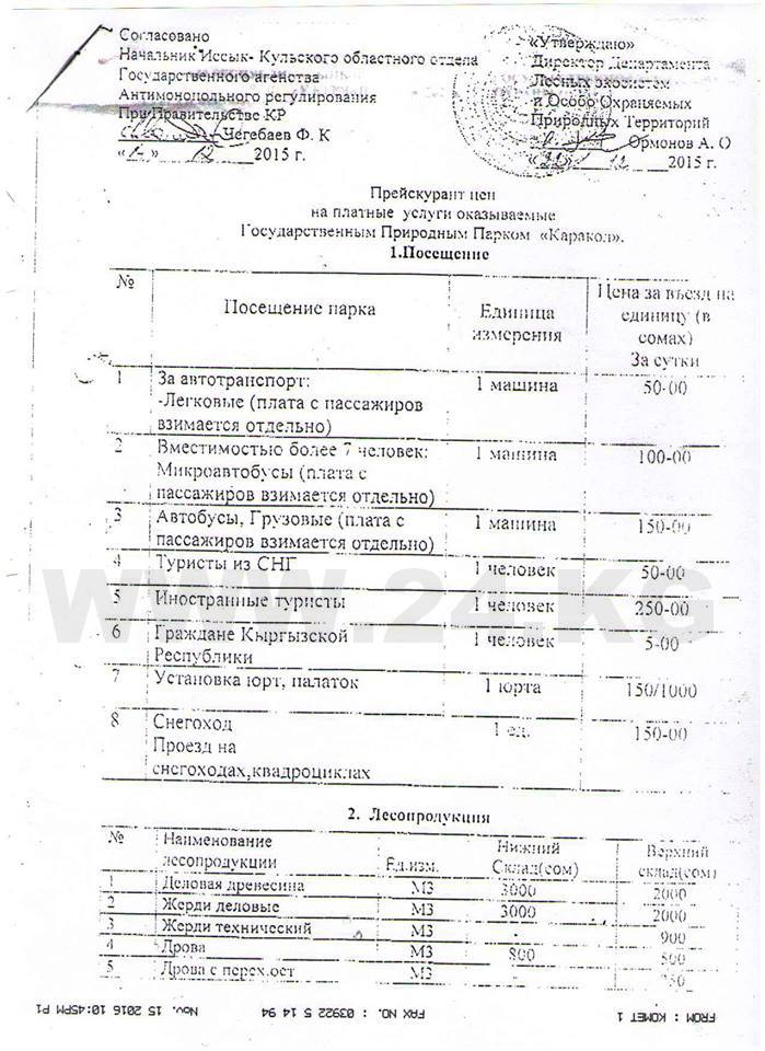 Согласно прейскуранту природного парка «Каракол», въезд на его территорию гражданам Кыргызстана и СНГ обойдется в 50 сомов. А вот иностранным туристам из дальнего зарубежья придется заплатить в пять раз больше. Прейскурант действует как зимой, так и летом.